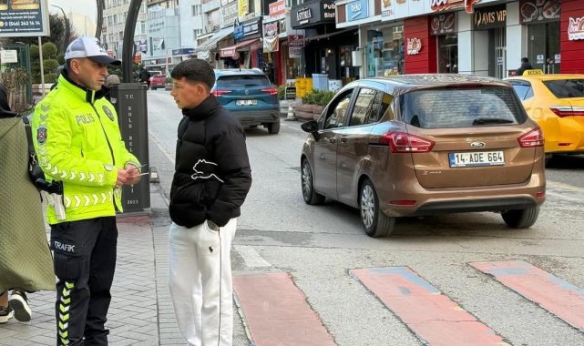 Bolu'da trafik polisleri, yaya kazalarının önüne geçmek amacıyla Cumhuriyet Caddesi'nde denetim ve bilgilendirme çalışması yaptı. Yaya geçidini kullanan vatandaşlara "sol-sağ-sol" kuralını hatırlatan ekipler, telefon ve kulaklık kullanımı konusunda uyarılarda bulundu.