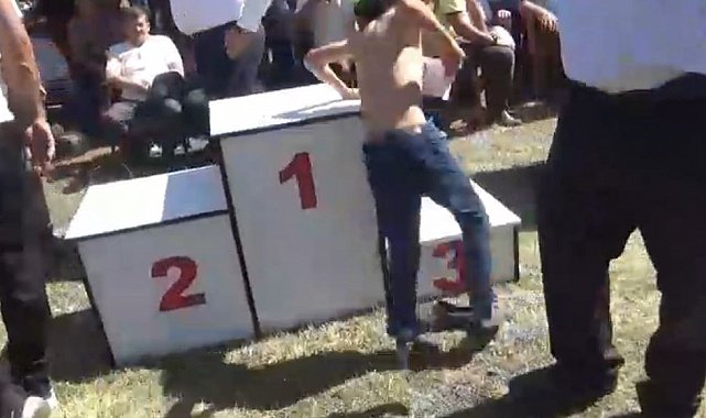 Yayla bayramında güreşte birinci olan minik sporcu kürsüye çıkarken ayakkabılarını çıkardı