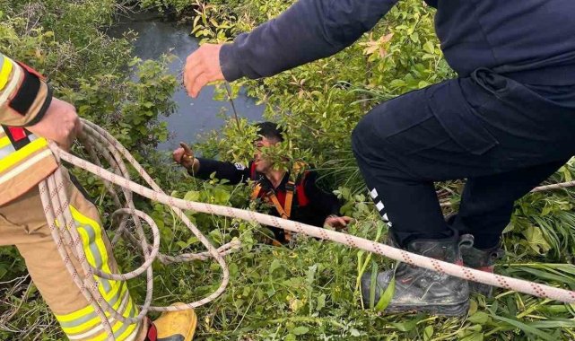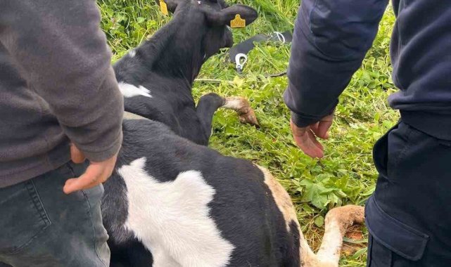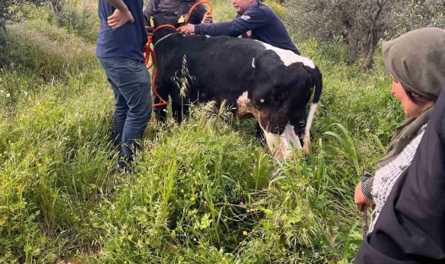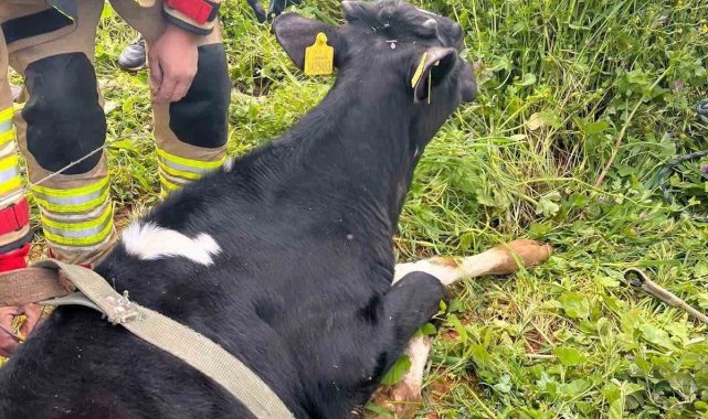 Hatay'ın Yayladağı ilçesinde su göletine düşerek mahsur kalan büyükbaş hayvan, itfaiye ekiplerinin çalışmasıyla kurtarıldı.