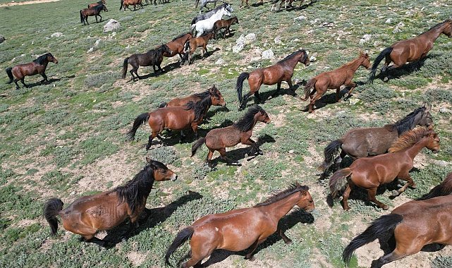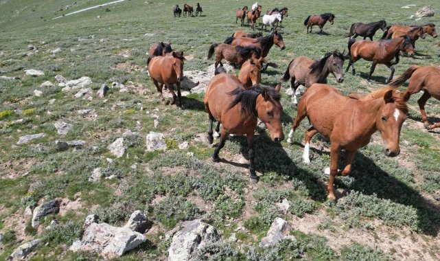 Sevimlilikleri ve ürkeklikleri ile bilinen yılkı atları yaz mevsimin gelmesi ile yaylardan aşağı inmeye başlarken, atların sürülerin halinde gezdiği anlar ise dron kameralarına yansıdı.