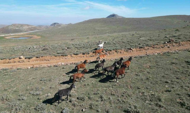 Yaylalardan köylere inmeye başlayan yılkı atları dron ile görüntülendi