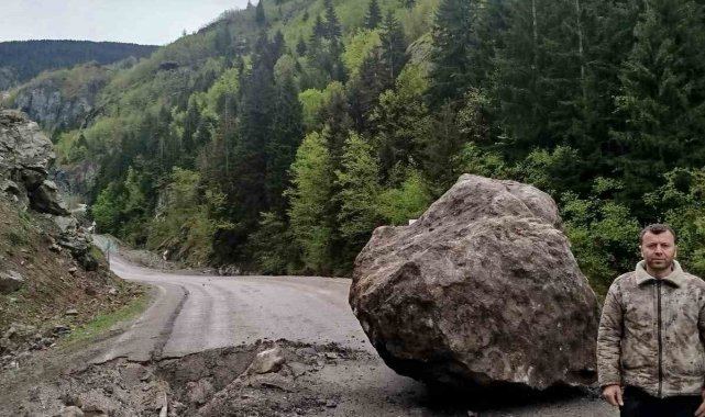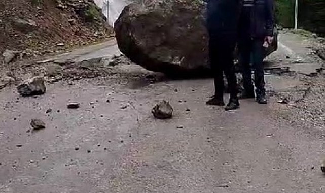 Yola düşen devasa kaya kütlesi Karayolları ekiplerinin çalışmasıyla kaldırılırken, yol tekrar trafiğe açıldı.