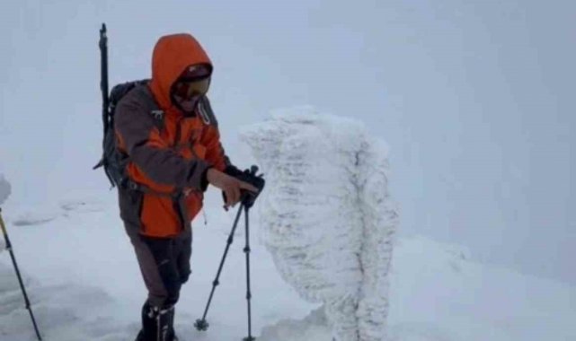 ELDAK'ın Hazar Baba Dağı'ndaki kış tırmanışında, yazın zirvede dalgalanan Türk bayrağının tamamen buz kestiği görüldü.