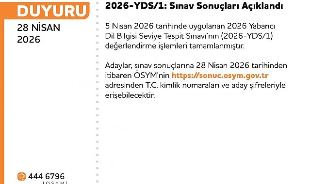 ÖSYM tarafından yapılan açıklamada, "5 Nisan tarihinde uygulanan 2026 Yabancı Dil Bilgisi Seviye Tespit Sınavı'nın (2026-YDS/1) değerlendirme işlemleri tamamlanmıştır. Adaylar, sınav sonuçlarına 28 Nisan tarihinden itibaren ÖSYM'nin https://sonuc.osym.gov.tr adresinden T.C. kimlik numaraları ve aday şifreleriyle erişebilecektir" ifadelerine yer verildi.