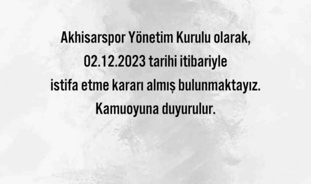Yapılan açıklamada, "Akhisarspor Yönetim Kurulu olarak, 02.12.2023 tarihi itibarıyla istifa etme kararı almış bulunmaktayız. Kamuoyuna duyurulur" ifadelerine yer verildi.