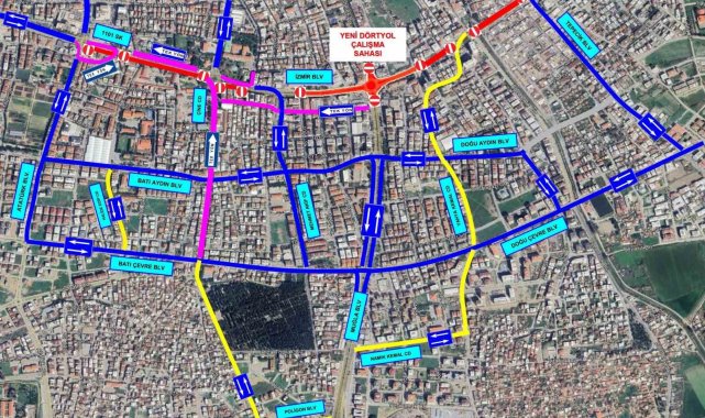 Astim Kavşağı (Denizli Aydın Yolu) - Havaalanı Bulvarı - Afrodisyas Bulvarı - Çevre Bulvarı - Çine Caddesi ya da Atatürk Bulvarı - İzmir Bulvarı'nı kullanacak. İzmir yönünden Denizli yönüne gitmek isteyenler, İzmir Bulvarı - Atatürk Bulvarı - Çevre Bulvarı - Afrodisyas Bulvarı - Havaalanı Bulvarı - Astim Kavşağı (Denizli Aydın Yolu) kullanacak. Güney - Doğu/ Doğu - Güney / Güney - Batı / Batı - Güney Yönleri, Muğla yönünden Denizli yönüne gitmek isteyenler: Muğla Bulvarı - Çevre Bulvarı - Afrodisyas Bulvarı - Havaalanı Bulvarı - Astim Kavşağı (Denizli Aydın Yolu) kullanacak. Denizli yönünden Muğla yönüne gitmek isteyenler, Astim Kavşağı (Denizli Aydın Yolu) - Havaalanı Bulvarı - Afrodisyas Bulvarı - Çevre Bulvarı - Muğla Bulvarı kullanacak. Muğla yönünden İzmir yönüne gitmek isteyenler, Muğla Bulvarı - Çevre Bulvarı ya da Batı Aydın Bulvarı - Çine Caddesi ya da Atatürk Bulvarı - İzmir Bulvarı'nı kullanacak. İzmir yönünden Muğla yönüne gitmek isteyenler, İzmir Bulvarı - Atatürk Bulvarı - Çevre Bulvarı - Muğla Bulvarı'nı kullanacak. Güney - Kuzey / Kuzey - Güney Yönleri, Kuzey yönünden İzmir ve Denizli bulvarlarının güneyine geçmek isteyenler: Adnan Menderes Bulvarı'nın Süleyman Seba Caddesi ile Albay Şefik Caddesi kesişiminden itibaren kapalı olması nedeniyle Atatürk Bulvarı, Sağlık Caddesi, Egemenlik Bulvarı ve Sanayi Caddesi güzergahlarını kullanabilecekler. Güney yönünden İzmir ve Denizli bulvarlarının kuzeyine geçmek isteyenler: Yeni Dörtyol Kavşağı ile İmam Hatip Kavşağı arası kapalı olacağından Tepecik Bulvarı, Egemenlik Bulvarı, 522 Sokak, Mehmet Akif Caddesi, Çine Caddesi ve Atatürk Bulvarı güzergahlarını kullanabilecekler.