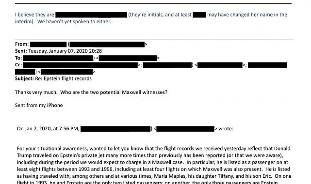 E-postada ayrıca, "1993 yılındaki bir uçuşta, listelenen tek iki yolcu kendisi ve Epstein'dır; bir başka uçuşta ise listelenen yalnızca üç yolcu bulunmaktadır: Epstein, Trump ve o dönemde 20 yaşında olan bir kişi. Diğer iki uçuşta ise yolculardan ikisi, ayrı ayrı olmak üzere, Maxwell davasında muhtemel tanıklar olabilecek kadınlardır. Tüm kayıtların (100 sayfadan fazla ve çok küçük puntolu metinlerden oluşan) incelemesini yeni tamamladık ve ileride bunun herhangi bir sürprize yol açmamasını istedik" denildi. E-postada, 20 yaşındaki kişinin kimliği de karartılmış bir şekilde verildi.