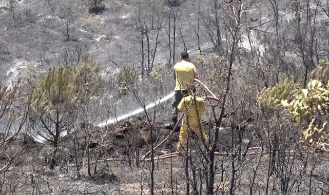 Geceyi soğutma çalışması yaparak geçiren ekipler havanın aydınlanmasıyla birlikte rüzgarın etkisiyle zaman zaman alevlenen bölgelere tek tek müdahale etti.