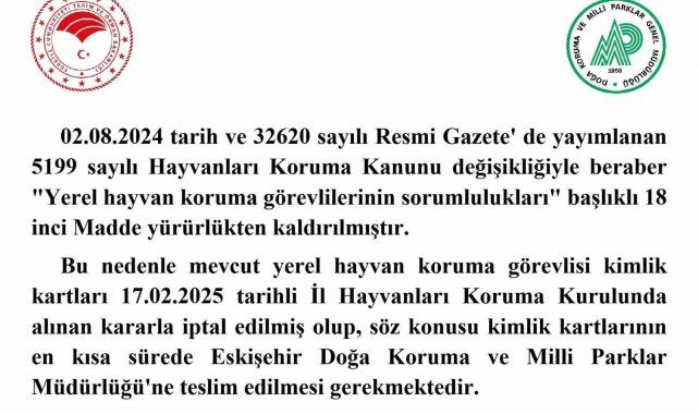 Eskişehir Doğa Koruma ve Milli Parklar Müdürlüğü (DKMP), mevcut yerel hayvan koruma görevlisi kimlik kartlarının iptal edildiğini açıkladı.