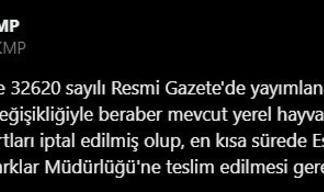 DKMP İl Müdürlüğü, alınan kararı sosyal medyadan duyurdu. Yapılan açıklamaya göre, 02 Ağustos 2024 tarih ve 32620 sayılı Resmi Gazete'de yayımlanan Hayvanları Koruma Kanunu değişikliğiyle beraber mevcut yerel hayvan koruma görevlisi kimlik kartlarını iptal edildi. Kartların en kısa sürede Eskişehir DKMP'ye teslim edilmesi gerektiği belirtildi.