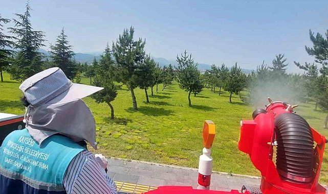 Kayseri Büyükşehir Belediyesi; park, bahçe ve mesire alanı gibi sorumluluk sahasında bulunan tüm yeşil alanlarda hastalık ve zararlılara karşı ilaçlama çalışmalarını titizlikle yürütüyor.