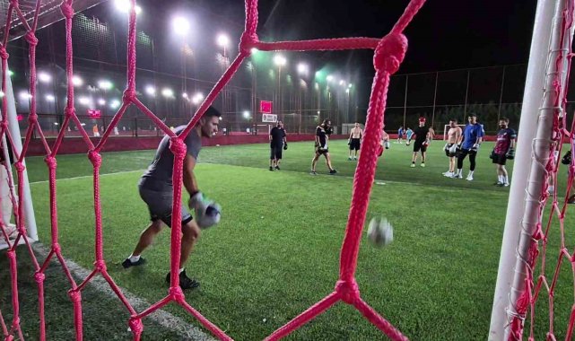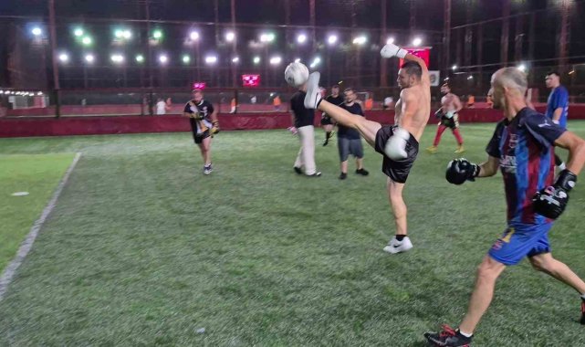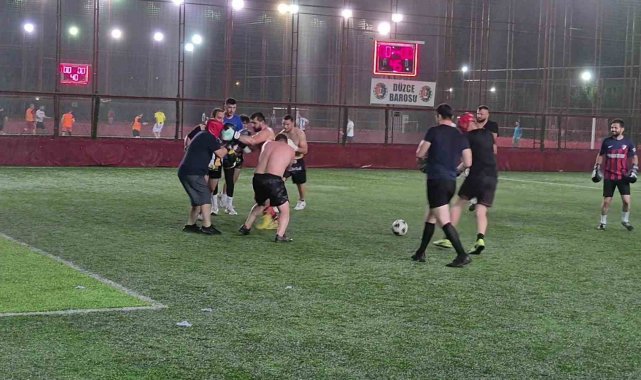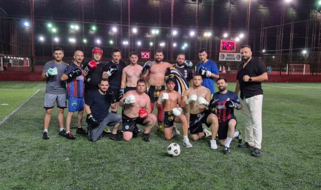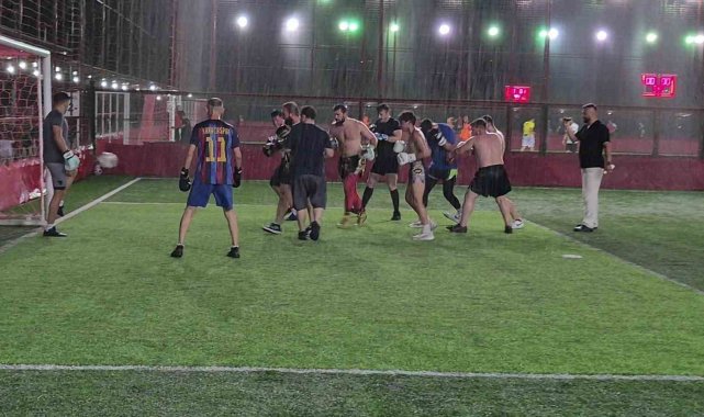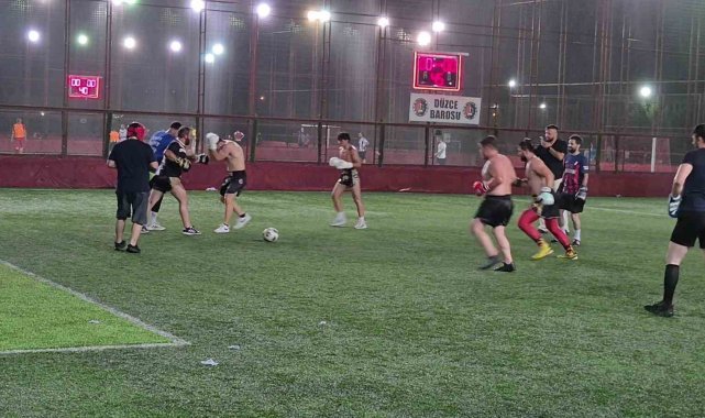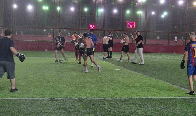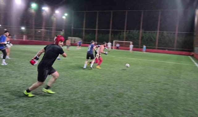 Düzce'de muaythai ve boks sporcuları, halı saha maçına boks eldivenleriyle çıkarken, hem futbol oynadılar hem de boks tekniklerini kullanarak sahayı ringe çevirdi.