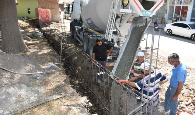Eskişehir'in İnönü ilçesinde yıkılma tehlikesi bulunması sebebiyle belediye ekiplerince yıkılan 30 metrelik okul duvarı yeniden yapılıyor.