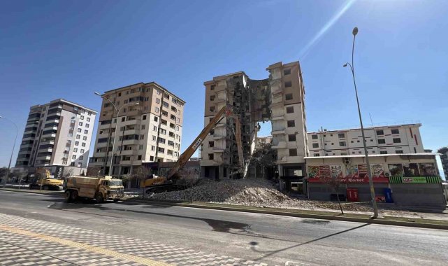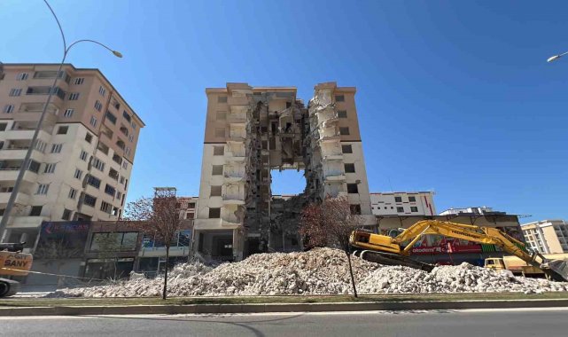 Kahramanmaraş'ta depremlerde ağır hasar alan binaların yıkım çalışmaları sürüyor. Onikişubat İlçesi Maarif Mahallesi'nde bir binanın ağır hasar aldı. Binanın tam ortasının boş kalarak gövde kısmının adeta dev bir pencere gibi açılması dikkat çekti. Yıkım sırasında ortaya çıkan görüntü, vatandaşların cep telefonlarıyla kaydedildi. Bölgede yıkım çalışmalarının sürdüğü öğrenildi.