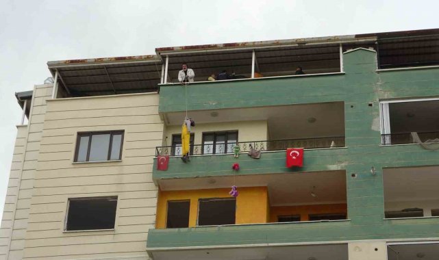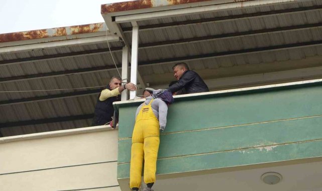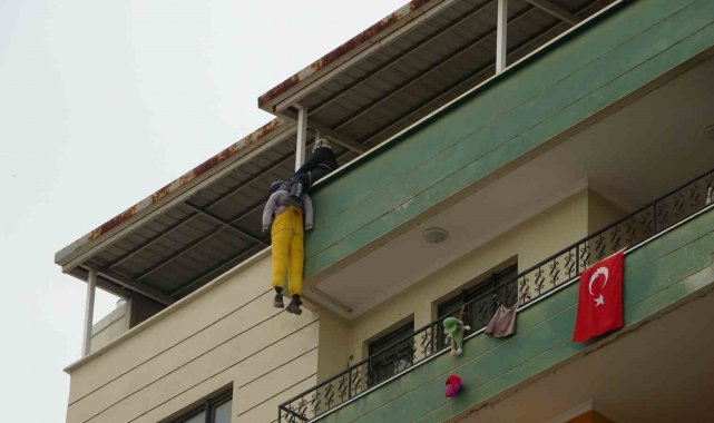 Malatya'da 7 katlı ağır hasarlı binanın yıkım kararına ihtiraz eden apartman sakini bir kadın, çıktığı teras katın demir ayaklarına kendini iple bağlayarak intihar girişiminde bulundu. Zaman zaman kendini aşağı sarkıtan kadını polis son anda kurtardı.