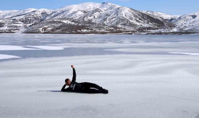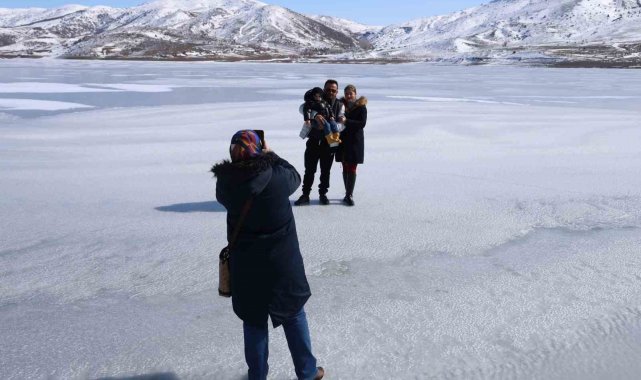 Dondurucu soğukların yaşandığı Sivas'ta Yıldız baraj gölünün yüzeyi tamamen buz tuttu, meraklıları üzerinde yürüyerek fotoğraf çektirdi.