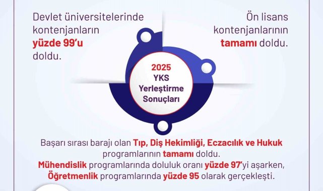 Yükseköğretim Kurumları Sınavı (YKS) yerleştirme sonuçları açıklandı. Devlet üniversitelerinde kontenjanların yüzde 99'u doldu, ön lisans kontenjanlarının doluluk oranı yüzde 100 oldu.