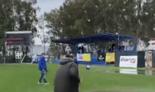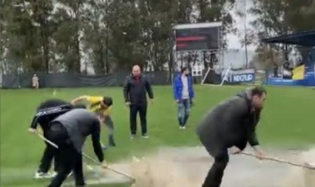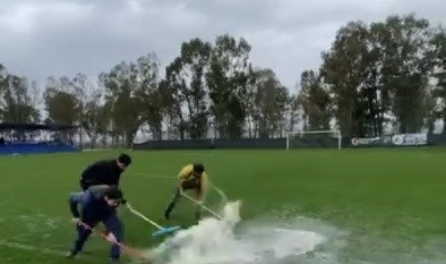 Yoğun yağış nedeniyle oluşan su birikintilerini taraftar ve görevliler temizledi