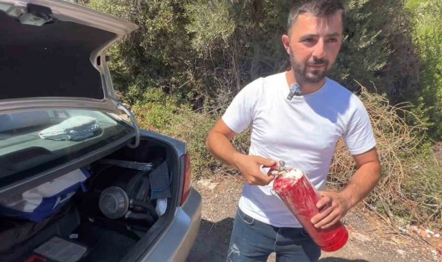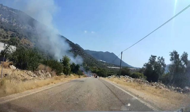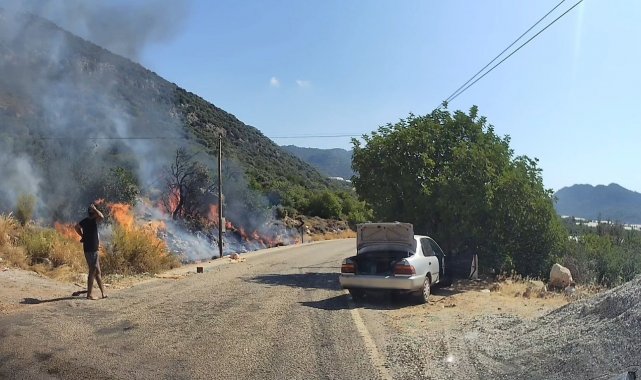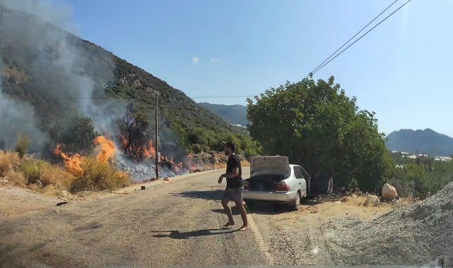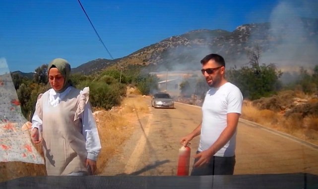 Antalya'nın Kaş ilçesi Kekova yolu istikametinde çıkan yangın, bölgeden geçen tatilci aile tarafından araçtaki yangın tüpüyle müdahale edilerek vatandaşların da desteğiyle kısa sürede söndürüldü. O anlar ailenin aracının kamerasına yansıdı.