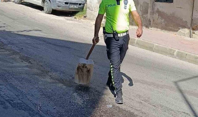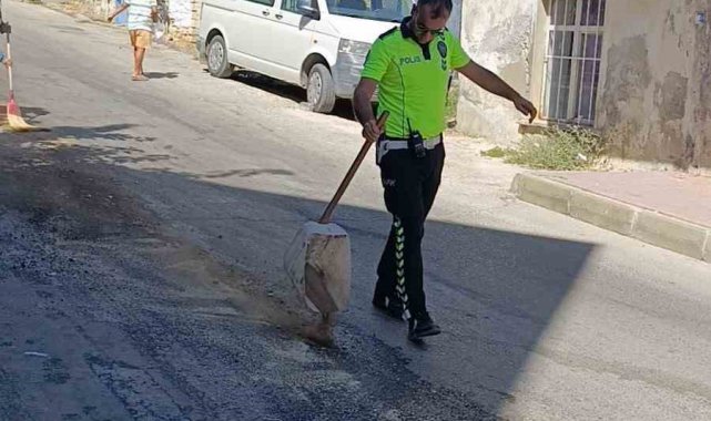 Antalya'nın Manavgat ilçesinde dökülen sıvı nedeniyle kayganlaşan yolda devrilen motosiklet sürücüsü yaralandı. Güvenlik kamerasına da yansıyan kaza sonrası kayganlaşan yola trafik polisi yol kenarından getirdiği toprağı dökerek önlem aldı.