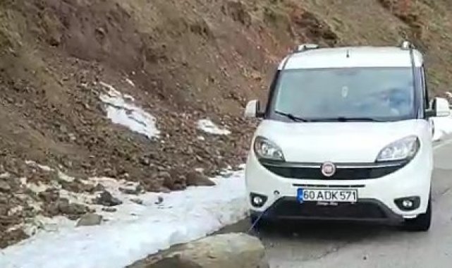 Tokat'ta seyir halindeyken yola düşen kaya parçası, vatandaşları dikkati ve duyarlı davranışı sayesinde tehlike oluşturmadan yol kenarına çekildi.