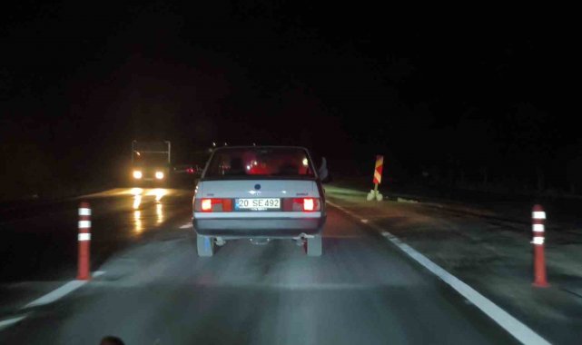 Denizli-Antalya kara yolunda kent merkezi istikametinde seyir halinde olan 20 SE 492 plakalı Tofaş marka otomobilde bulunan yolcunun tehlikeli hareketi, cep telefonu kamerasıyla kaydedilmişti. Ön yolcu koltuğunda oturan vatandaş, iki ayağını da dışarıya çıkartarak kilometrelerce yol yolculuk yaptığı görüntülendi.
