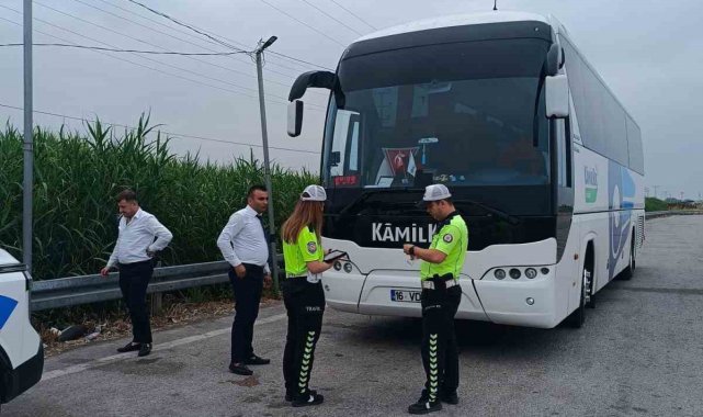 Bursa'nın Karacabey İlçesinde Bölge Trafik İstasyon Amirliği ekipleri, Bursa-İzmir ve Bursa-Çanakkale karayolu üzerinde şehirlerarası yolculuk yapan otobüslere yönelik denetimleri sıklaştırdı.