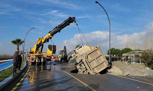 Yolda oluşan çukura düşen hafriyat kamyonu vinç yardımı ile kurtarıldı