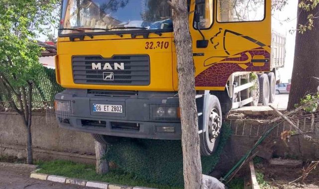 Yoldan çıkan kamyon duvarda asılı kaldı