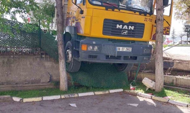 Çorum'un Sungurlu ilçesinde yoldan çıkan kamyon, duvarda asılı kaldı.