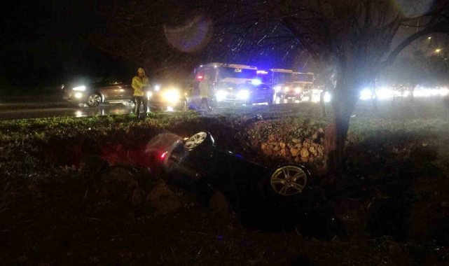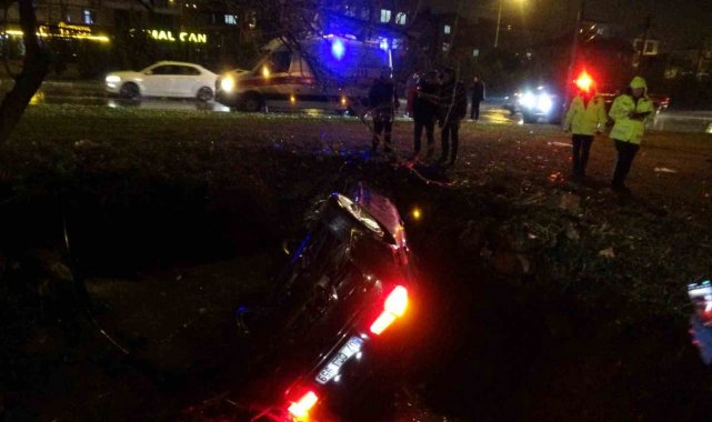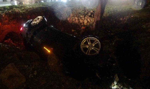 Yoldan çıkan lüks otomobil refüjdeki çukura düştü:3 yaralı