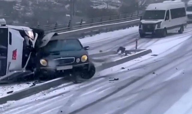 Yollar buz pistine döndü, minibüs devrildi, otomobil refüje çıktı