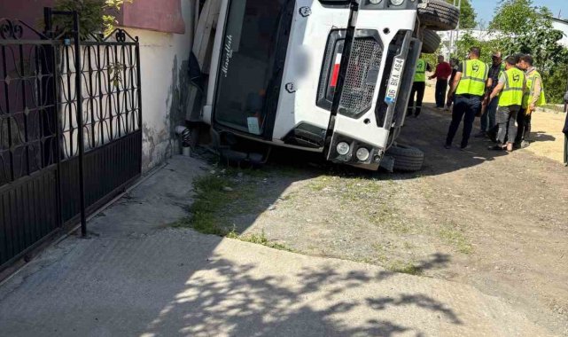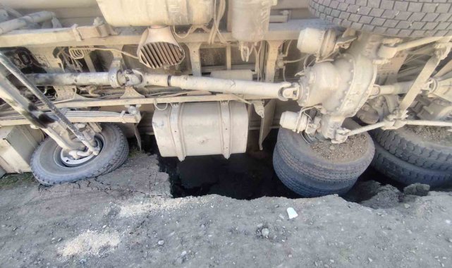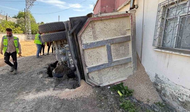 Yolun çökmesiyle kum yüklü kamyon devrildi