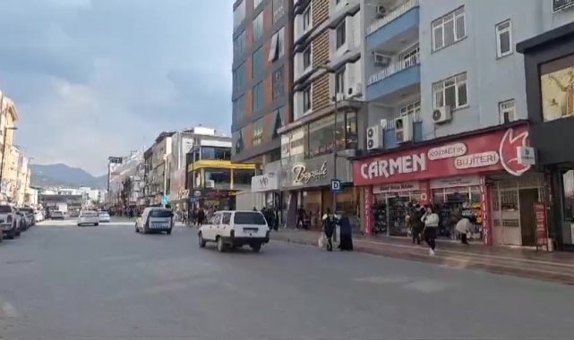 Hatay'da yolun karşısına geçmekte zorlanan yaşlı kadına polis memurunun yardım ettiği anlar kameraya yansıdı.