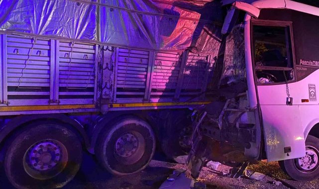 Manisa'nın Turgutlu ilçesinde meydana gelen trafik kazasında bir kablo fabrikasına işçi taşıdığı öğrenilen servis aracı yolun sağında duran tıra arkadan çarptı.