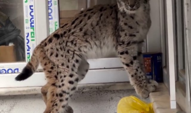 Torul ilçe merkezinde yolunu şaşıran yavruluktan çıkmış vaşak, bir evin önüne kadar geldi.