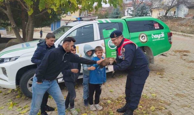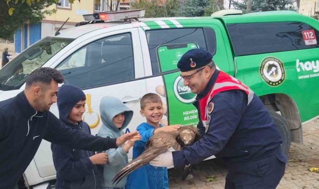 Yozgat'ta bulunan yaralı kızıl şahin çocukların ilgi odağı oldu