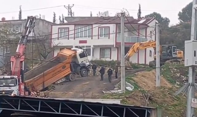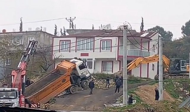 Yük boşaltan kamyon askıda kaldı