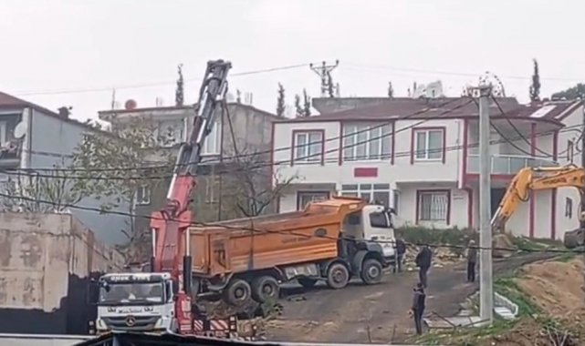 Kocaeli'nin Dilovası ilçesinde hafriyat dökümü sırasında geri kayarak askıda kalan kamyon, vinç ve iş makinesi yardımıyla bulunduğu yerden çıkarıldı.