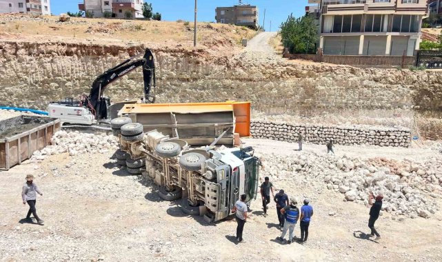 Adıyaman'ın Besni ilçesinde yük boşaltma sırasında kontrolden çıkan kamyon devrildi.