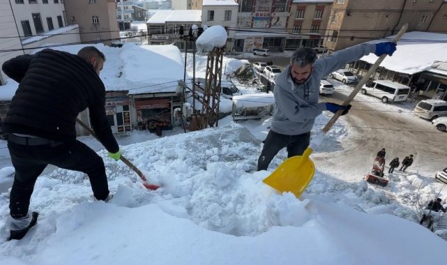 Yüksekova'da 20 kişilik ekibin çatıda kar temizleme mesaisi