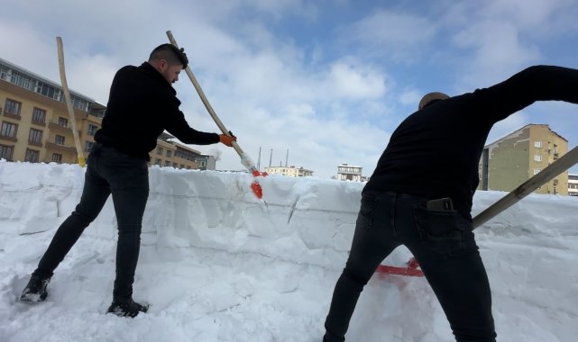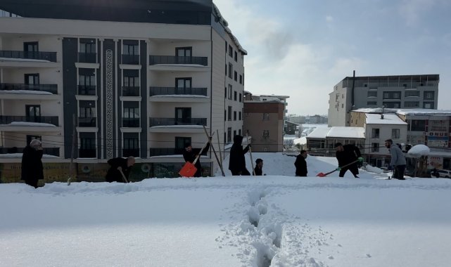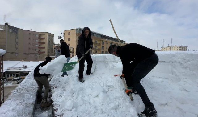 İlçe genelinde devam eden kar yağışı ve gece saatlerinde sıfırın altında 30 dereceye kadar düşen dondurucu soğuklar, günlük yaşamı olumsuz etkilemeye devam ediyor. Kar kalınlığının yer yer 2 metreyi bulduğu ilçede, bina çatılarında oluşan dev kar kütleleri ve buz sarkıtları ise tehlike oluşturuyor. Cumhuriyet Mahallesi'nde faaliyet gösteren bir alışveriş merkezinin çatısında biriken kar miktarının tehlikeli boyuta ulaşması üzerine işletme personeli harekete geçti. Yaklaşık 20 kişiden oluşan personel grubu, güvenlik önlemlerini alarak dev yapının çatısına çıktı. Zemini tamamen buz tutan ve yaklaşık 1 metre kalınlığa ulaşan kar kütlelerini küreklerle tahliye eden çalışanlar, zorlu hava şartlarına rağmen yoğun bir mesai harcadı.