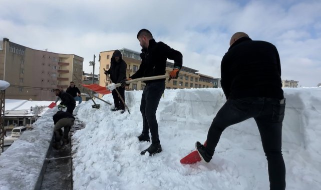 Hakkari'nin Yüksekova ilçesinde etkili olan yoğun kar yağışının ardından bir alışveriş merkezinin çatısında biriken kar kütleleri, 20 kişilik ekibin hummalı çalışmasıyla temizlendi.