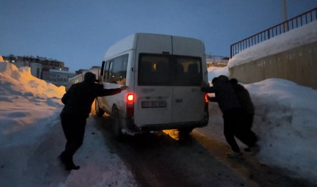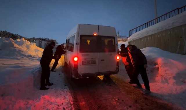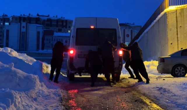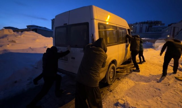 Esenyurt Mahallesi'ndeki yokuşu çıkmaya çalışan minibüs, zemindeki aşırı buzlanma nedeniyle yolda mahsur kaldı. Aracın ilerleyemediğini gören mahalle sakinleri, kısa sürede bir araya gelerek sürücüye yardım etmek için seferber oldu. Vatandaşların yaklaşık 2 saat süren zorlu çalışması ve el birliğiyle itilmesi sonucu minibüs, mahsur kaldığı buzlu alandan kurtarıldı.