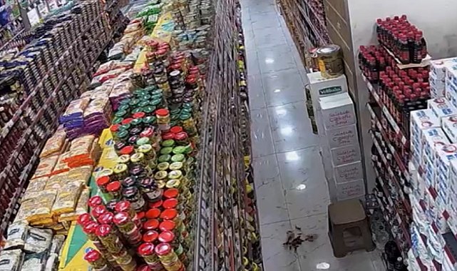 Depremin meydana geldiği sırada, Cengiz Topel Caddesi üzerinde bulunan bir markette raflarda bulunan ürünlerin sarsıntının etkisiyle yere düştüğü anlar güvenlik kamerasına yansıdı.
