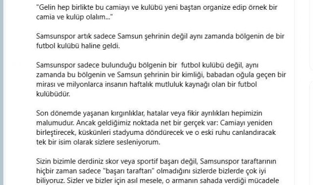 "Gelin hep birlikte yeni bir hayalin peşinde koşalım: Artık sizlerin hayali de benim hayalim olan Şampiyonlar Ligi hayali olsun. Her bir Samsunspor taraftarının uykularını kaçıran o büyük rüyayı hep birlikte önümüzdeki 3-5 sene içinde yaşamanın hayalini yaşayalım. Eğer sizlerin ve bizlerin amacı bir ve hedefi ortaksa; sizler bu ordunun başında yeniden güçlü bir komutan olarak beni daha aktif hâlde görmek istiyorsanız ben de bu görevi yeniden üstlenmeye hazırım, diyorum. Ben de bu kulübe maddi ve manevi çok şey katmaya devam edeceğimi taahhüt ediyorum. O zaman ben de diyorum ki şimdi en büyük yatırımı yapma vakti gelmiştir. Gelin bu mübarek Ramazan'da hep birlikte taraftarın gönlündeki o sönmeye yüz tutmuş ateşi yeniden yakalım. Gelin hep birlikte geçmişi ve gönül kırgınlıklarını bir kenara bırakalım ve tertemiz yeni bir sayfa açalım. Ben inanmıyorum ki artık bu şehir, bu taraftar ve bu Atatürk'lü arma sizin desteğinizle benim liderliğim etrafında kenetlenmiş tek bir yumruk hâlinde yeniden görmeye ve şahlanmaya hazır bekliyor. Birlikte başaracağız, birlikte çok daha güzeliz."