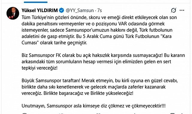Hakem kararları ile maçın skoruna etki edildiğini vurgulayan Yıldırım, "Tüm Türkiye'nin gözleri önünde, skoru ve emeği direkt etkileyecek olan son dakika penaltısını vermeyenler ve o pozisyonu VAR odasında görmek istemeyenler, sadece Samsunspor'umuzun hakkını değil, Türk futbolunun adaletini de gasp etmiştir. Bu 5 Aralık Cuma günü Türk futbolunun kara bir günü olarak tarihe geçmiştir. Biz Samsunspor olarak bu açık haksızlık karşısında susmayacağız! Bu kararın arkasındaki tüm sorumluların hesap vermesi için elimizden gelen en sert tepkiyi vereceğiz. Büyük Samsunspor taraftarı merak etmeyin, bu kirli oyuna en güzel cevabı, birlikte daha sıkı kenetlenerek ve gelecek maçlarda zaferler kazanarak vereceğiz. Birlikte başaracağız ve birlikte yükseleceğiz! Unutmayın, Samsunspor asla kimseye diz çökmez ve çökmeyecektir" dedi.