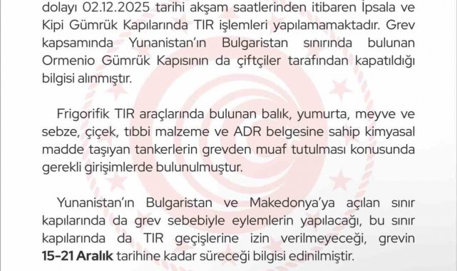 Yunanistan'da tarım politikalarına tepki gösteren çiftçilerin başlattığı grev, ülkenin sınır kapılarında ulaşımı ve ticareti durma noktasına getirdi. Çiftçi blokajları sebebiyle 2 Aralık akşam saatlerinden itibaren tamamen duran İpsala ve Kipi Gümrük Kapılarındaki tır geçişlerinin 21 Aralık 2025 tarihine karar yapılamayacağı bildirildi.