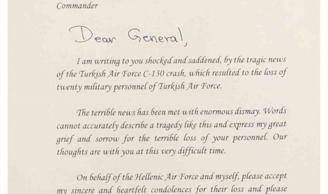 Mesajda, "Sayın General, Türk Hava Kuvvetleri'ne ait C-130 tipi uçağın düşmesi sonucu 20 Türk Hava Kuvvetleri askerinin hayatını kaybetmesiyle sonuçlanan trajik haberi duydum. Şok ve üzüntü içinde size yazıyorum. Bu korkunç haber büyük bir üzüntüyle karşılandı. Kelimeler böyle bir trajediyi tam olarak anlatamaz ve personelinizi kaybetmenin verdiği büyük acıyı ve üzüntüyü ifade edemez. Bu zor zamanda düşüncelerimiz sizinle. Yunan Hava Kuvvetleri ve şahsım adına, lütfen içten ve samimi taziyelerimi kabul edin, ailelere ve Türk Hava Kuvvetleri personeline en derin taziyelerimi iletin" ifadeleri yer aldı.