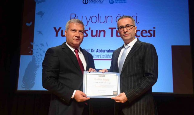 "Bu Yolun Ötesi, Yunus'un Türkçesi" konferansı soru cevap kısmının ardından Anadolu Üniversitesi Rektörü Prof. Dr. Yusuf Adıgüzel tarafından Yunus Emre Enstitüsü Başkanı Prof. Dr. Abdurrahman Aliy'e katkılarından dolayı teşekkür belgesi ve hediye takdim edildi.